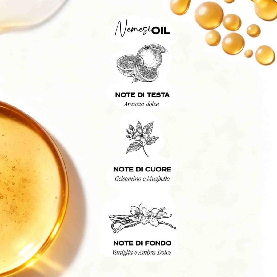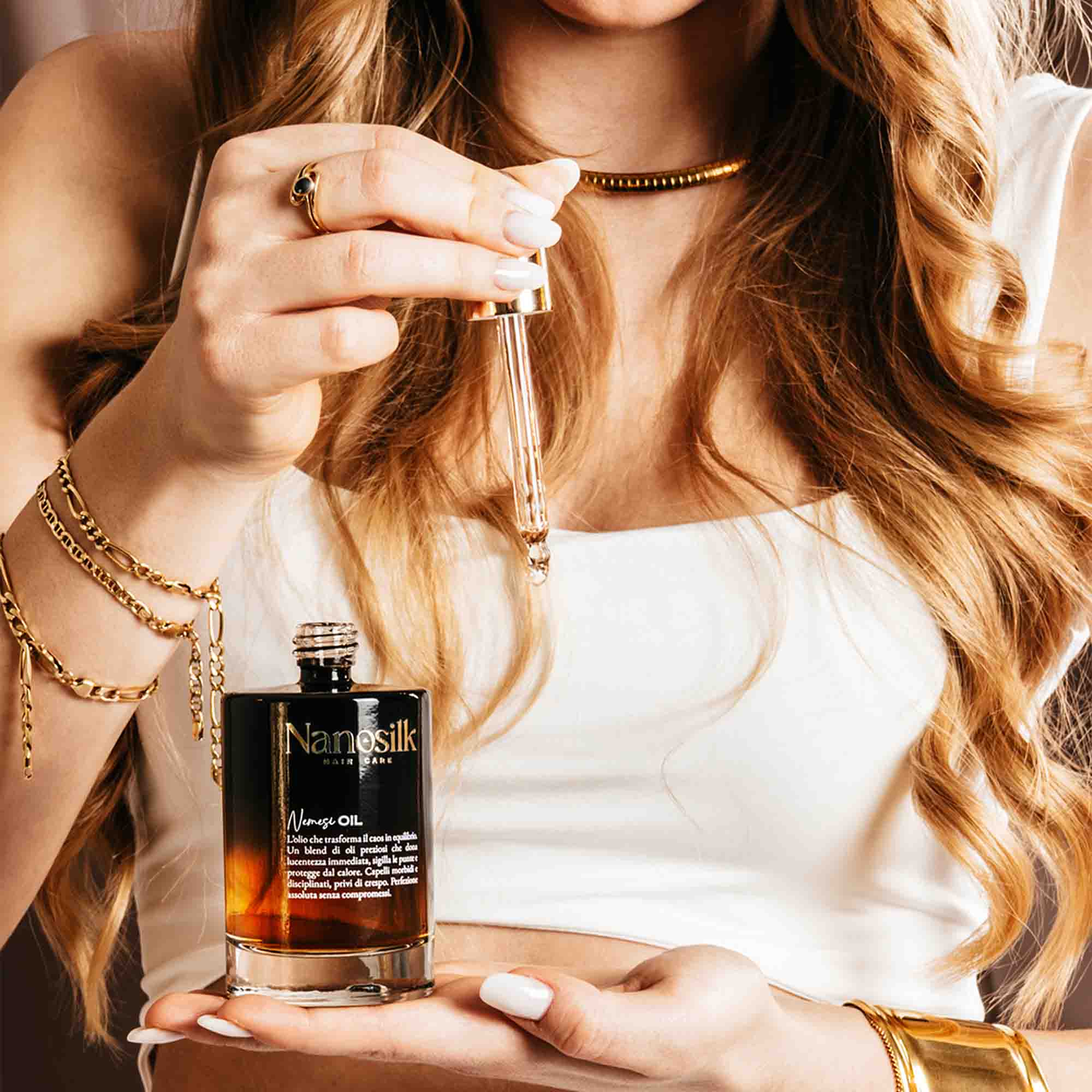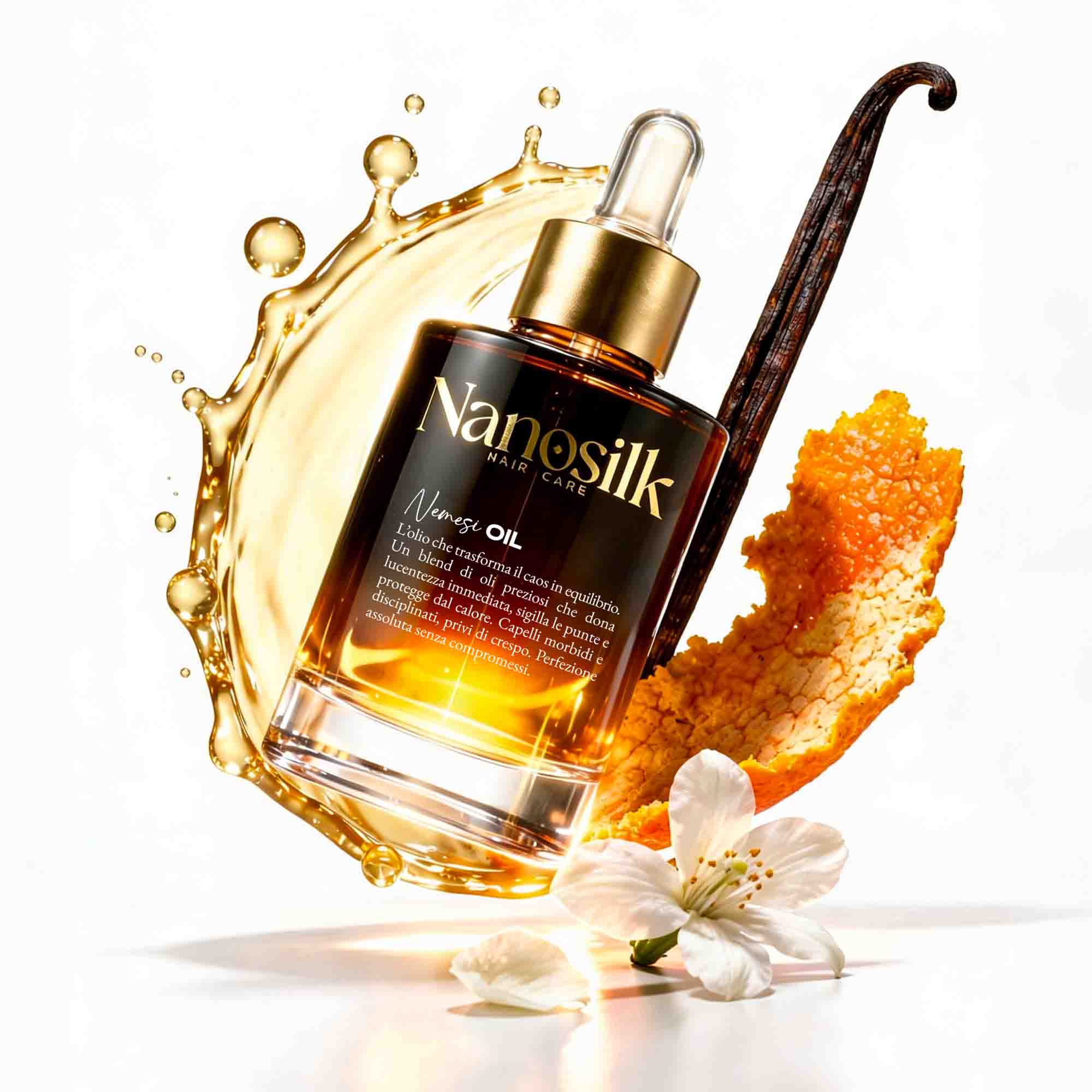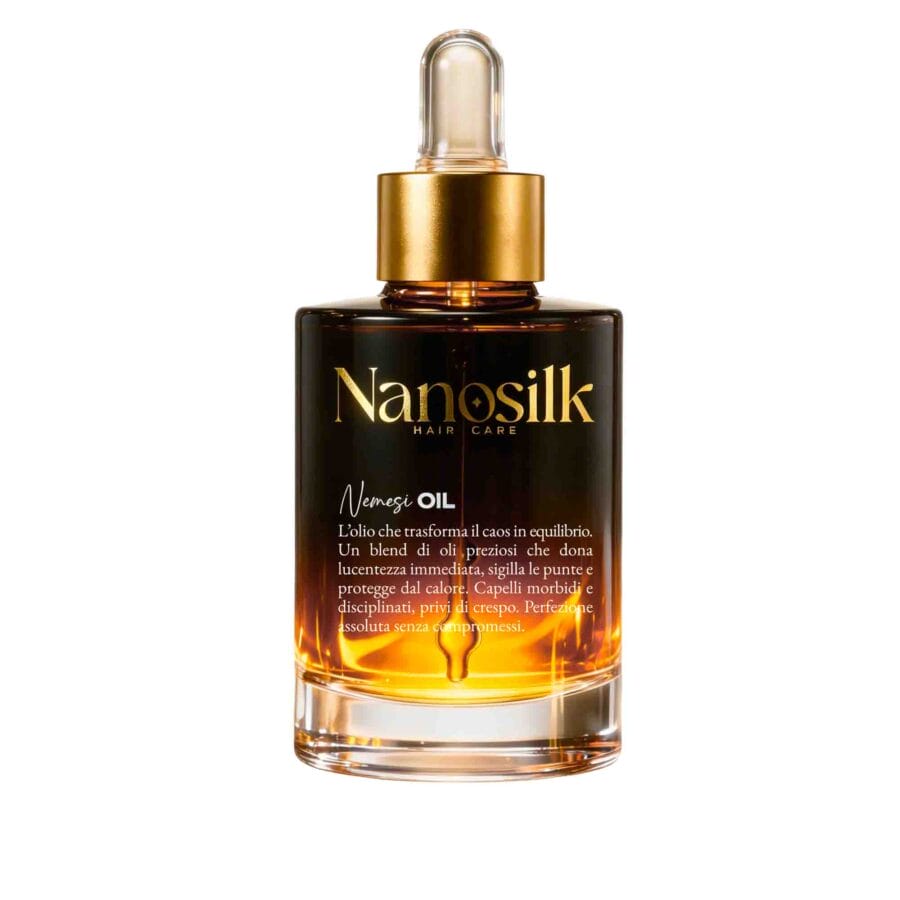 Nemesi รจ un olio capelli professionale ultra-premium, arricchito con un blend di oli botanici e proteine della seta, studiato per donare lucentezza effetto specchio, morbidezza, controllo immediato del crespo and protezione dal calore