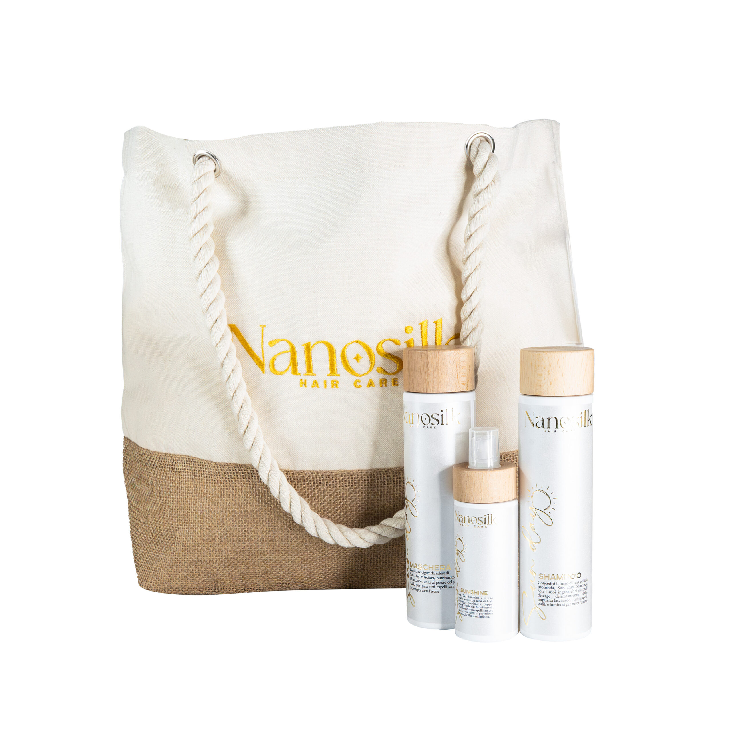 Take the Nanosilk Sun Day Collection with you and protect your hair all summer long.โ€จThis elegant beach bag includes a 250 ml shampoo and 250 ml mask, specially formulated to cleanse, hydrate, and repair hair exposed to sun, chlorine, and salt water, leaving it soft, smooth, and frizz-free.โ€จPerfect for maintaining and extending the results of Nanoplasty treatments.